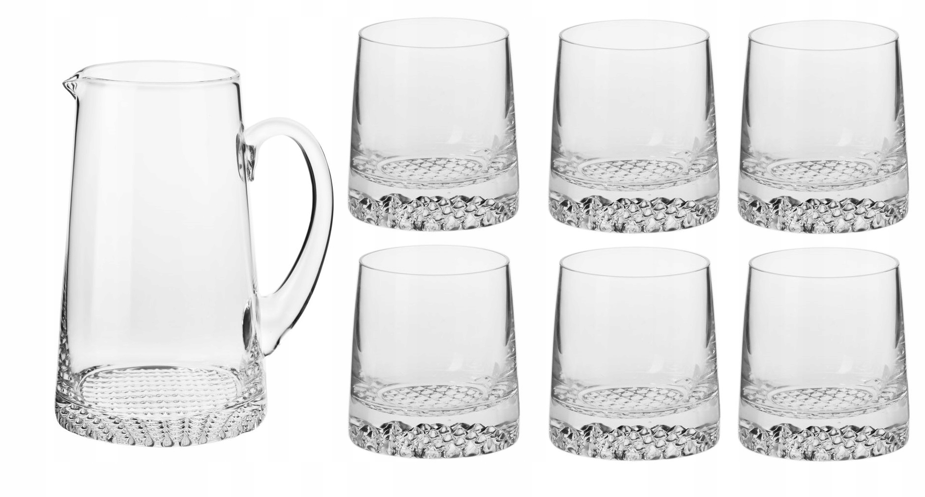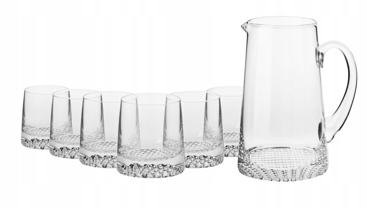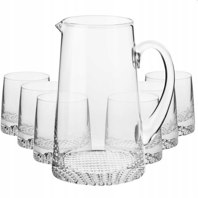 Zestaw składa się z ręcznie formowanego dzbanka o pojemności 1000 ml oraz sześciu niskich szklanek do napojów o pojemności 300 ml każda.