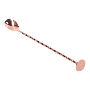 Kompletujesz asortyment profesjonalnego barmana? Świetnie trafiłeś! Przed Tobą łyżka barmańska w miedzianym kolorze. Stanowi ona doskonałe uzupełnienie pozostałych narzędzi zarówno zawodowego, jak i dopiero początkującego miksologa. Prezentowana łyżka barmańska miedziana ma aż 28 cm długości, a na jej końcu umieszczona została stopka. Dodatkowo produkt został specyficznie skręcony, co korzystnie wpływa na jego design.