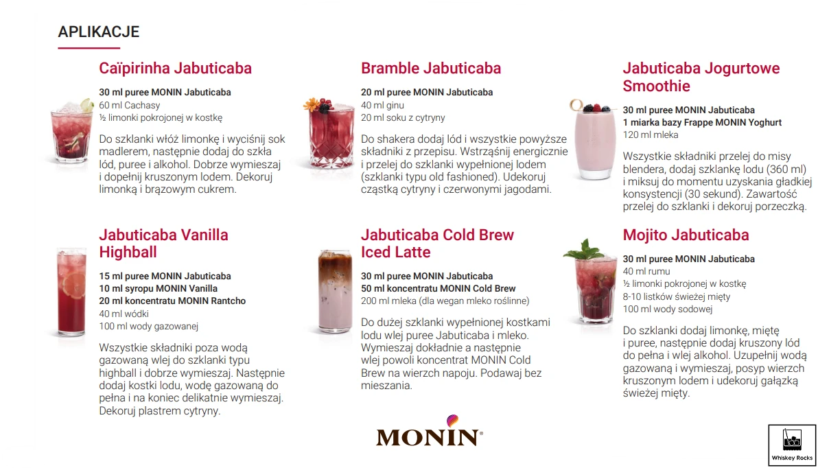 "Zanurz się w kulturze brazylijskiej z nowym puree MONIN Jabuticaba i podkręć swoje ulubione koktajle niedostępnym dotąd, egzotycznym smakiem! Poczuj oryginalne jagodowo-winogronowe nuty i wnieś jasny fioletowy kolor do Swoich kreacji. Puree Jabuticaba ma szereg zastosowań, od koktajli po napoje orzeźwiające...