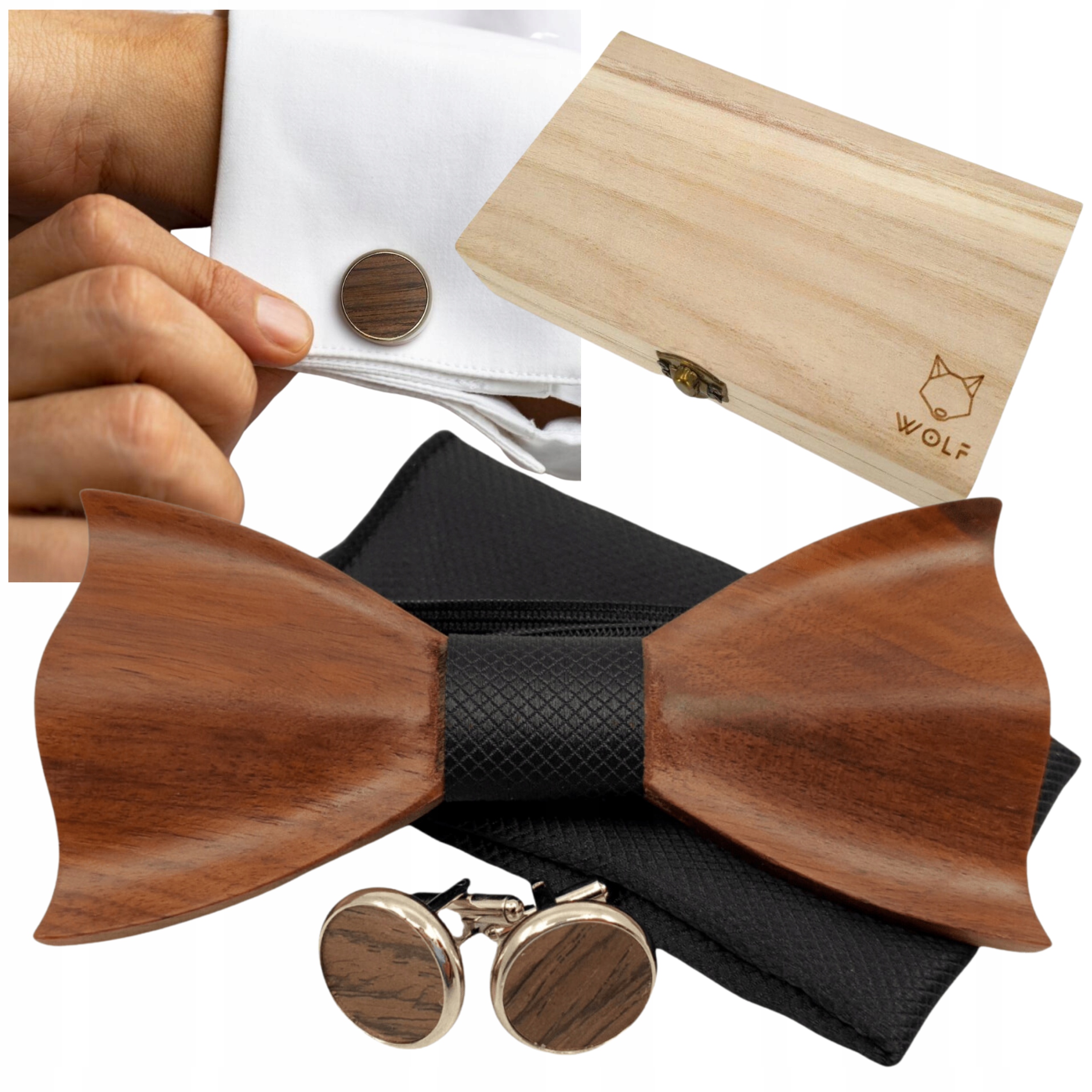 - ➡️ Drewnianą muszkę wykonaną z litego drewna orzechowego – elegancką i unikalną.