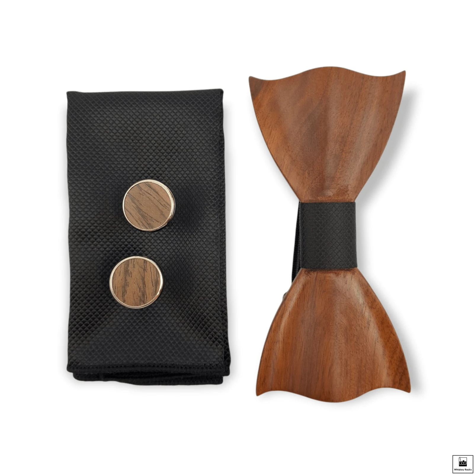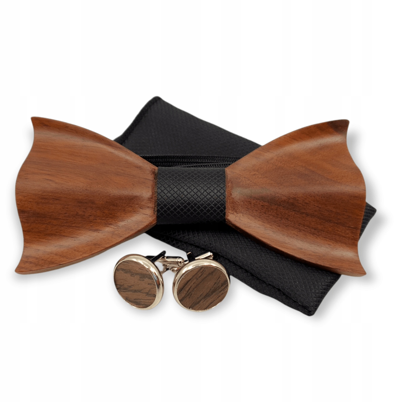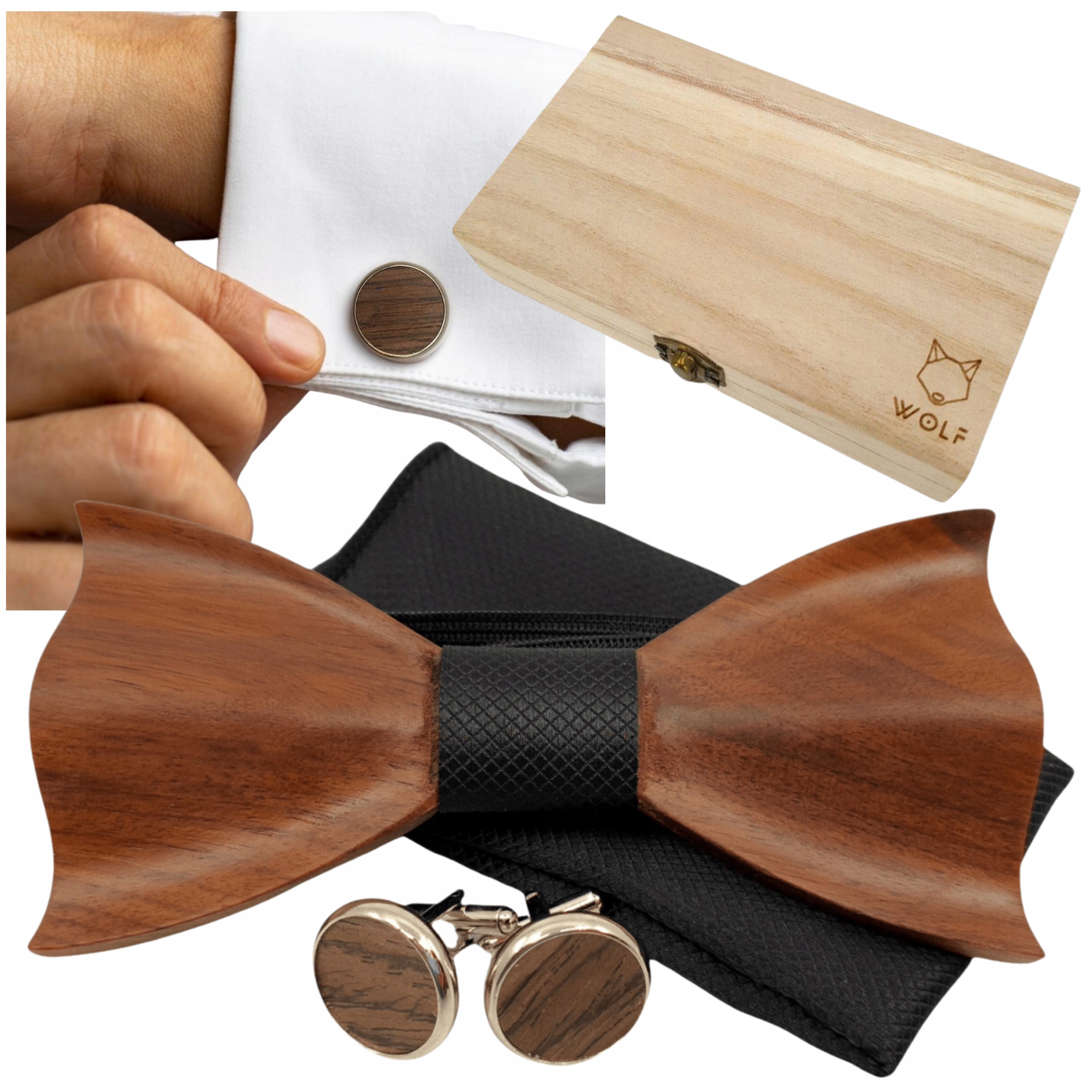 - ➡️ Drewnianą muszkę – ręcznie wykonaną z litego drewna orzechowego.