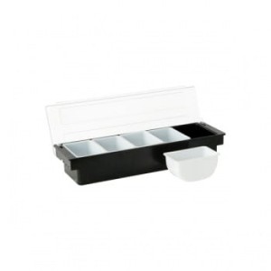 Oferowany przez nas pojemnik barmański na dodatki jest wykonany z wysokiej jakości materiałów (HIPS, ABS), dzięki czemu zapewni skuteczną ochronę przed ewentualnym zniszczeniem. Produkt został podzielony na pięć przegródek, co umożliwia wygodne segregowanie różnorodnych artykułów, takich jak owoce, zioła czy kostki lodu. Dzięki zamykanej konstrukcji zawartość jest skutecznie chroniona przed zanieczyszczeniami z zewnątrz, jednocześnie pozwala zachować higienę oraz świeżość składników. Wyjmowane elementy ułatwiają dokładne mycie całego pojemnika, gwarantując komfort użytkowania oraz długotrwałą czystość.